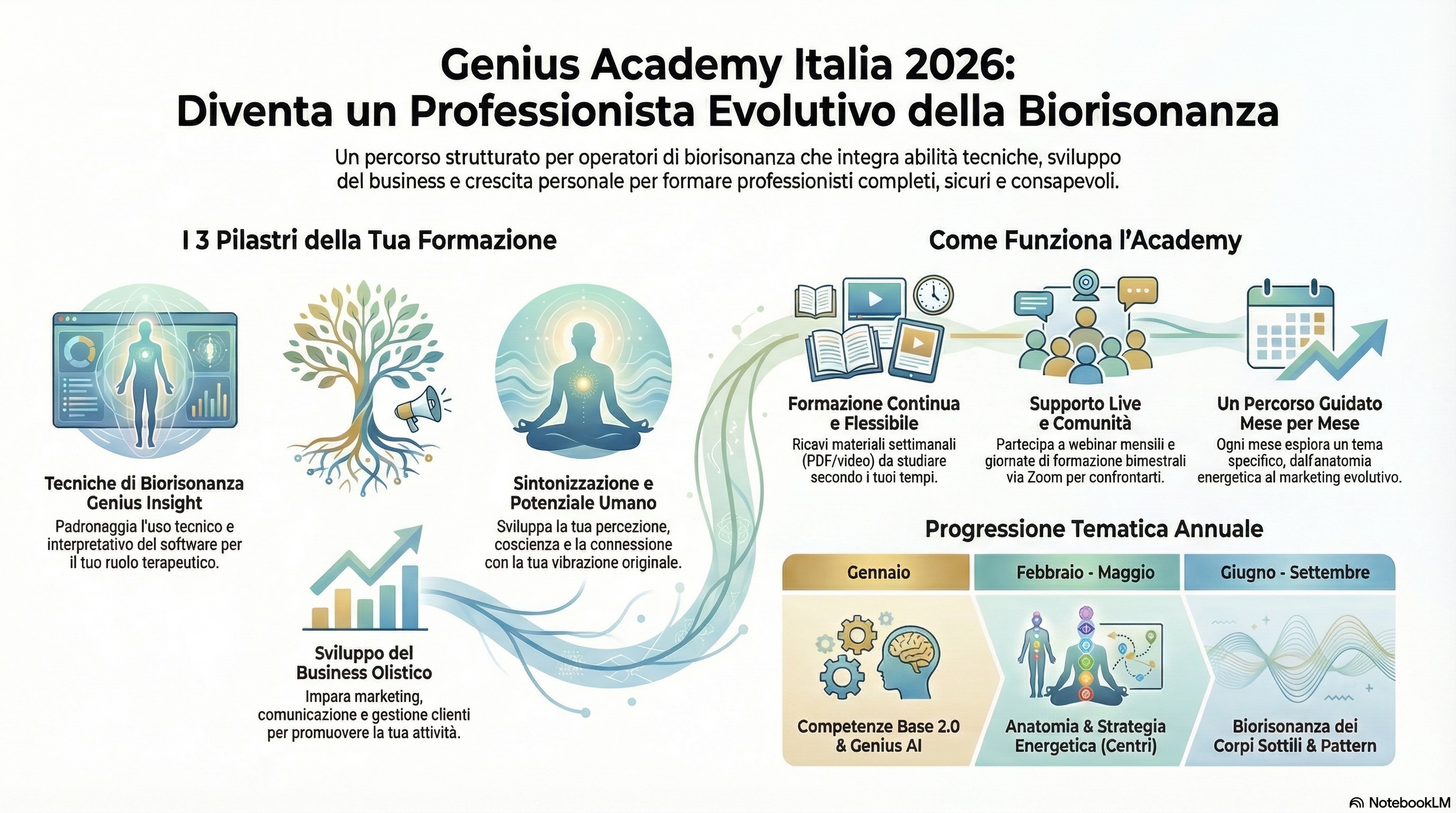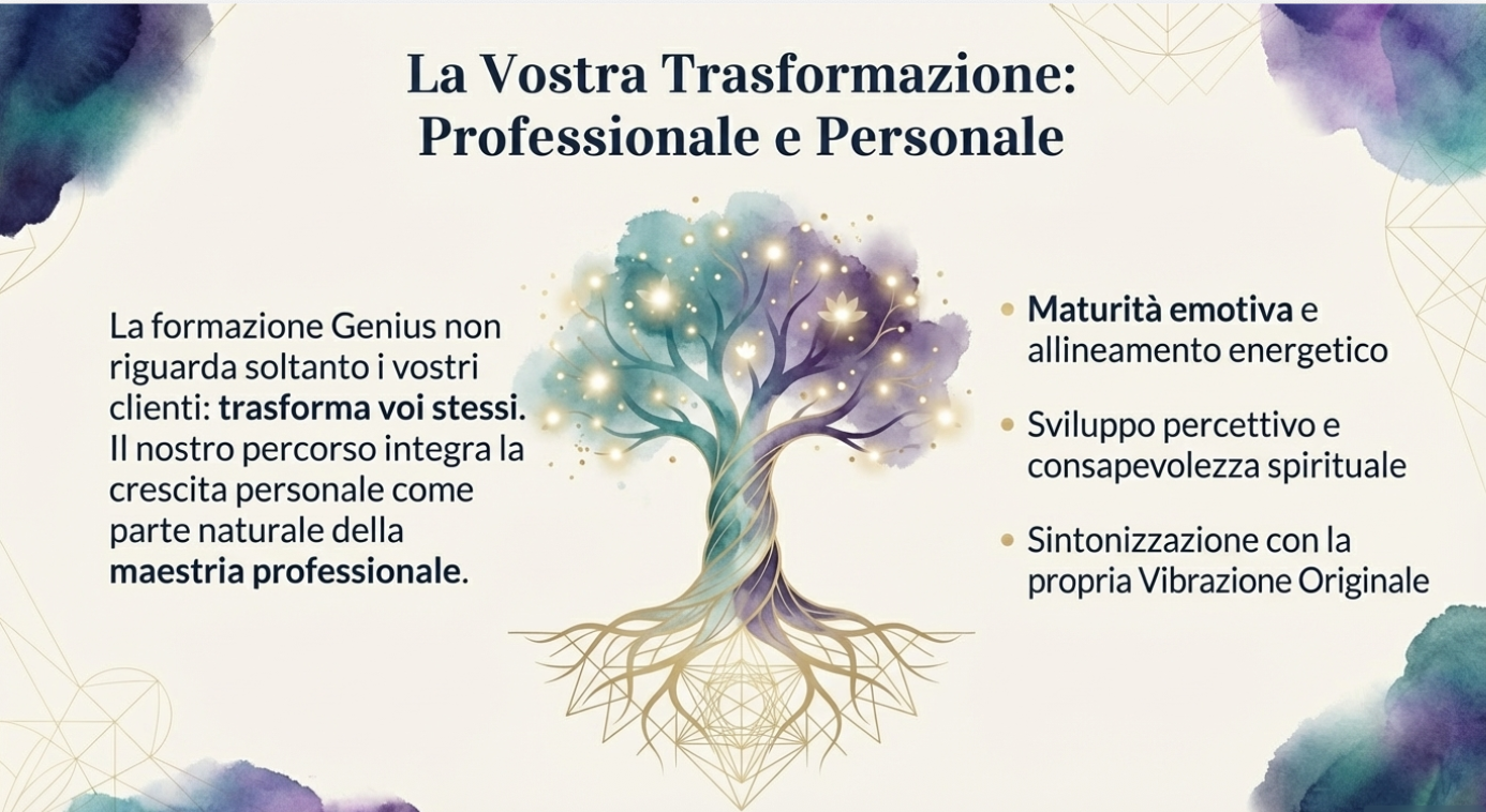 La formazione Genius non riguarda soltanto i clienti: trasforma gli operatori stessi.✓ integrare crescita personale, maturità emotiva, allineamento energetico, sviluppo percettivo e consapevolezza spirituale come parte naturale del percorso professionale.