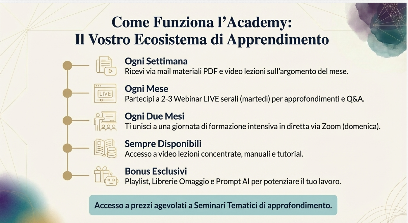 ✓ sviluppare competenza interpretativa attraverso un modello unico (strati, chakra, sistemi, causalità) che semplifica l’uso del Genius e stabilizza la comprensione.